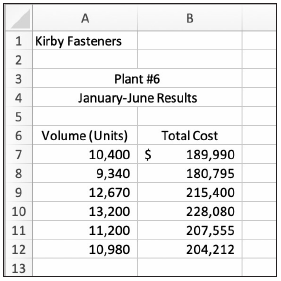 Kirby Fasteners supplies the electronics industry with accessories for cases, disc enclosures, and so on. Below are the costs and volumes for the past six months at its Plant #6: