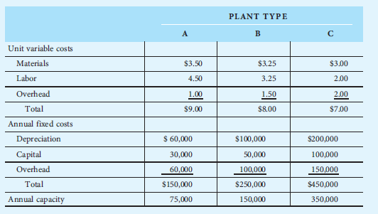 PLANT TYPE A B C Unit variable costs Materials $3.50 $3.25 $3.00 Labor 4.50 3.25 2.00 Overhead 1.00 1.50 2.00 Total $9.00 $8.00 $7.00 Annual fixed costs Depreciation $60,000 $100,000 $200,000 Capital 30,000 50,000 100,000 Overhead 60,000 100,000 150,000 Total $150,000 $250,000 $450,000 Annual capacity 75,000 150,000 350,000