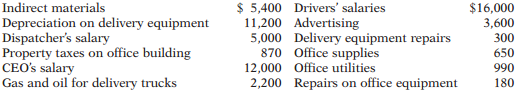 $ 5,400 Drivers' salaries 11,200 Advertising 5,000 Delivery equipment repairs 870 Office supplies 12,000 Office utilities 2,200 Repairs on office equipment Indirect materials $16,000 3,600 Depreciation on delivery equipment Dispatcher's salary Property taxes on office building CEO's salary Gas and oil for delivery trucks 300 650 990 180