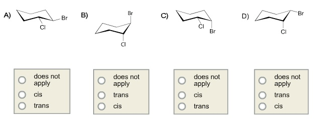 Br Br A) Br B) D) Br CI does not apply does not apply does not apply does not apply cis trans cis trans trans cis trans cis