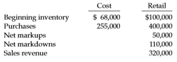 Cost Retail $ 68,000 255,000 Beginning inventory Purchases Net markups Net markdowns $100,000 400,000 50,000 110,000 Sales revenue 320,000