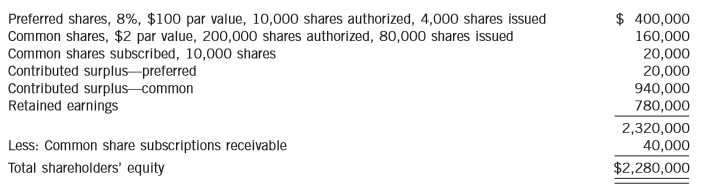 Preferred shares, 8%, $100 par value, 10,000 shares authorized, 4,000 shares issued Common shares, $2 par value, 200,000 shares authorized, 80,000 shares issued Common shares subscribed, 10,000 shares Contributed surplus-preferred Contributed surplus-common Retained earnings $ 400,000 160,000 20,000 20,000 940,000 780,000 2,320,000 40,000 Less: Common share subscriptions receivable Total shareholders' equity $2,280,000