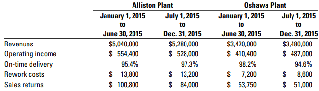 Alliston Plant Oshawa Plant January 1, 2015 July 1, 2015 January 1, 2015 July 1, 2015 to to to to June 30, 2015 Dec. 31, 2015 June 30, 2015 Dec. 31, 2015 Revenues $5,040,000 $5,280,000 $3,420,000 $3,480,000 $ 554,400 $ 528,000 $ 410,400 $ 487,000 Operating income On-time delivery 95.4% 97.3% 98.2% 94.6% $ 13,800 $ 100,800 $ 13,200 $ 84,000 Rework costs 7,200 $ 8,600 Sales returns $ 53,750 $ 51,000