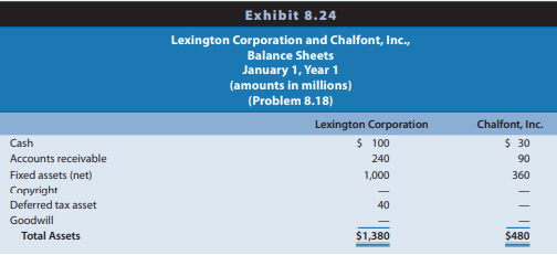 Lexington Corporation acquired all of the outstanding common stock of Chalfont, Inc., on January 1, Year 1. Lexington gave shares of its no par common stock with a market value of $504 million in exchange for the Chalfont common stock. Chalfont will remain a legally separate entity after the exchange, but Lexington will prepare consolidated financial statements with Chalfont each period. Exhibit 8.24 presents the balance sheets of Lexington and Chalfont on January 1, Year 1, just prior to the acquisition. The market value of Chalfontâs fixed assets exceeds their book value by $80 million. Chalfont owns a copyright with a market value of $50 million. Chalfont is a defendant in a lawsuit that it expects to settle during Year 1 at a cost of $30 million. The firm carries no insurance against such lawsuits. Lexington plans to establish an acquisition reserve for this lawsuit.