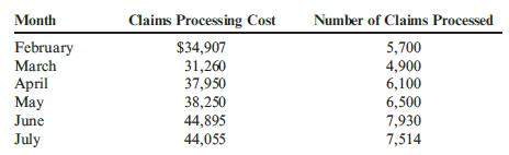 Li Ming was able to separate the costs of processing claims from the costs of running the departments of accounting and human resources. He gathered the data on claims processing cost and the number of claims processed per month for the past six months. These data are as