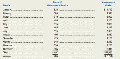 Hours of Maintenance Month Maintenance Service Costs $ 4,710 January Febnuary 525 505 4,310 2,990 March 310 April May 495 4,200 315 3,000 4,215 June 485 July August September 315 2,950 3,680 405 475 4,100 3,250 October 345 November 350 3,260 December 335 3,015 $43,680 $ 3,640 Total 4,860 Average 405
