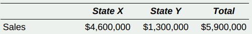 State X State Y Total Sales $4,600,000 $1,300,000 $5,900,000 Рayroll 1,200,000 800,000 2,000,000 Average property 2,200,000 700,000 2,900,000