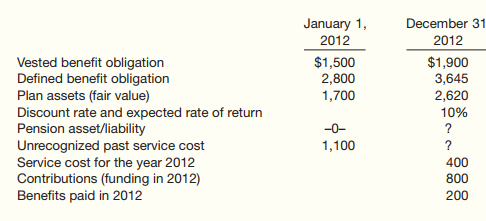 > The following defined pension data of Doreen Corp. apply to the year 2012. Defined benefit obligation, 1/1/12 (before amendment) ……………………………… $560,000 Plan assets, 1/1/12 ……………………………………………………………………………..………. 546,200 Pension asset/liability…………………………………………