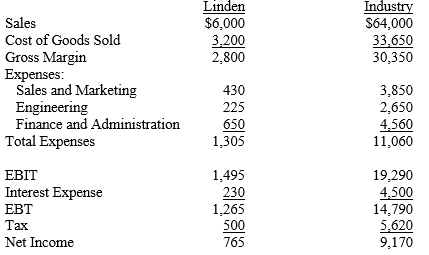 Linden $6,000 3,200 2,800 Industry $64,000 33,650 30,350 Sales Cost of Goods Sold Gross Margin Expenses: Sales and Marketing Engineering Finance and Administration Total Expenses 3,850 2,650 4,560 11,060 430 225 650 1,305 1,495 230 1,265 500 19,290 4,500 14,790 5,620 9,170 EBIT Interest Expense EBT Таx Net Income 765