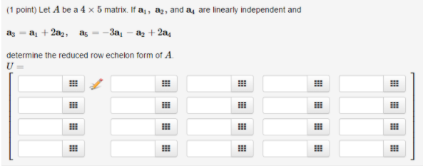 > Just fill in the blanks as the answers. Also try to make it clear as to which answer goes to which blank. (1 point) Let A be a 4 x 5 matrix. If a, a2, and a are linearly independent and ag = a + 2a2, ag = -3a, - a + 2a4 determine the reduced row ech