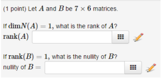 (1 point) Let A be a 4 x 5 matrix. If a, a2, and a are linearly independent and az = a + 2a2, as = -3a, – az + 2a4 determine the reduced row echelon form of A. U (1 point) Let A and B be 7 × 6 matrices. If dimN(A) = 1, what is the rank of A? rank(A) If rank(B) = 1, what is the nullity of B? %3D nullity of B