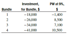 Listed below are bundles, each comprised of three independent proposals for which the PW has been estimated. For a capital investment limit of $45,000 and a MARR of 9% per year, the bundle selected is: