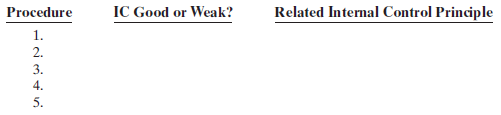 Indicate whether each procedure is an example of good internal control or of weak internal control. If it is an example of good internal control, indicate which internal control principle is being followed. If it is an example of weak internal control, indicate which internal control principle is violated. Use the table below.
