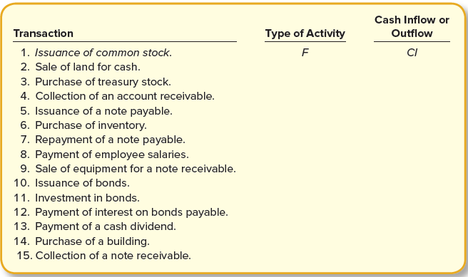 Listed below are several transactions. For each transaction, indicate by letter whether the cash effect of each transaction is reported in a statement of cash flows as an operating (O), investing (I), financing (F), or noncash (NC) activity. Also, indicate whether the transaction