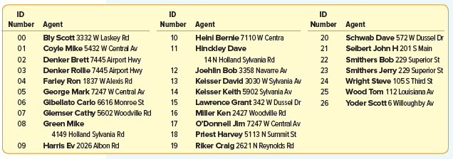 ID ID ID Number Agent Number Agent Number Agent 00 Helni Bernle 7110W Centra Bly Scott 3332 W Laskey Rd Coyle Mike 5432 W Central Av 10 20 Schwab Dave 572W Dussel Dr 01 11 Hinckley Dave 21 Selbert John H 201S Main 02 Denker Brett 7445 Airport Hwy Denker Rolle 7445 Airport Hwy 14N Holland Sylvania Rd Joehlin Bob 3358 Navarre Av 22 Smithers Bob 229 Superior St Smithers Jerry 229 Superior St 03 12 23 Kelsser David 3030 W Sylvania Av Kelsser Keith 5902 Sylvania Av 04 Farley Ron 1837 WAlexis Rd George Mark 7247 W Central Av 13 24 Wright Steve 105S Third St Wood Tom 112 Louisiana Av 05 14 25 06 Gibellato Carlo 6616 Monroe St 15 Lawrence Grant 342 W Dussel Dr 26 Yoder Scott 6 Willoughby Av 07 Glemser Cathy 5602 Woodville Rd 16 Miller Ken 2427 Woodville Rd 08 Green Mike 17 O'Donnell Jim 7247 W Central Av 4149 Holland Sylvania Rd 18 Priest Harvey 5113 N Summit St 09 Harris Ev 2026 Albon Rd 19 Riker Craig 2621 N Reynolds Rd