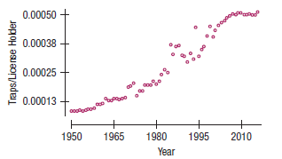 Lobster are caught in traps, which are baited and left in the open ocean. Licenses to fish for lobster are limited, there is a small additional fee for each trap in use, and there are limits on the numbers of traps that can be placed in each of seven fishing zones. But those limits have changed over time. Hereâs a scatterplot of the number of traps per licensed lobster fisher over time: