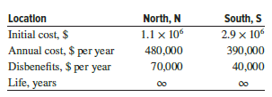 Locations under consideration for a border patrol station have their costs estimated by the federal government. Use the B/C ratio method at an interest rate of 6% per year to determine which location to select, if any.