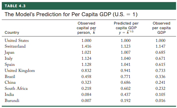 TABLE 4.3 The Model's Prediction for Per Capita GDP (U.S. = 1) Predicted per capita GDP y = k3 Observed Observed capital per person, k per capita GDP Country United States 1.000 1.000 1.000 Switzerland 1.416 1.123 1.147 Japan Italy Spain United Kingdom 1.021 1.007 0.685 1.124 1.040 0.671 1.128 1.041 0.615 0.832 0.941 0.733 Brazil 0.458 0.771 0.336 China 0.323 0.686 0.241 South Africa 0.218 0.602 0.232 India 0.084 0.437 0.105 Burundi 0.007 0.192 0.016