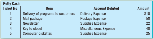 Loriâs Music School created a $200 petty cash fund on May 1. During the month, the fund custodian authorized and signed five petty cash tickets:
