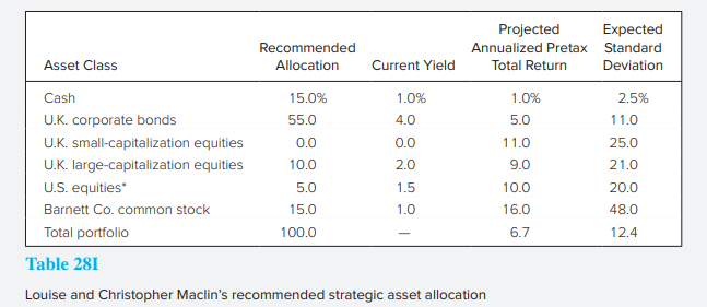 Louise and Christopher Maclin (see Problem 8) have purchased their house and made the donation to the local charity. Now that an investment policy statement has been prepared for the Maclins, Grant Webb recommends that they consider the strategic asset allocation described in Table 28I.