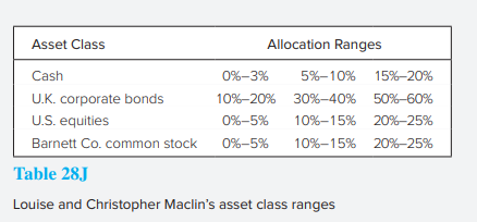 Recommend the most appropriate allocation range for each of the asset classes in Table 28J. Justify each appropriate allocation range with a reason based on the Maclinsâ investment objectives and constraints.