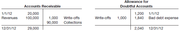 Allowance for Accounts Receivable Doubtful Accounts 1/1/12 20,000 100,000 1,200 1,840 Bad debt expense 1/1/12 1,000 90,000 Revenues Write-offs Write-offs 1,000 Collections 12/31/12 29,000 2,040 12/31/12