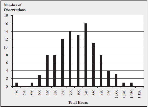 Lucky Smokes currently operates a warehouse that serves the Virginia market. Some trucks arrive at the warehouse filled with goods to be stored in the ware- house. Other trucks arrive at the warehouse empty to be loaded with goods. Based on the number of trucks that arrive at the warehouse in a week, the firm is able to accurately estimate the total number of labor hours that are required to finish all of the loading and unloading. The following histogram plots these estimates for each week over the past two years. (There are a total of 104 weeks recorded in the graph.) For example, there were three weeks in this period that required 600 total labor hours and only one week that recorded 1,080 hours of required labor.