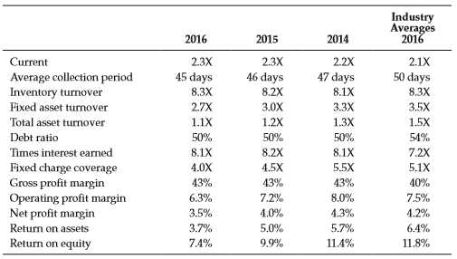 Industry Averages 2016 2016 2015 2014 2.2X 47 days Current 2.3X 2.3X 2.1X Average collection period Inventory turnover Fixed asset-turnover' data-toggle="tooltip" data-placement="top" title="Click to view definition...">asset Turnover 45 days 8.3X 50 days 46 days 8.2X 8.1X 8.3X 2.7X 3.0X 3.3X 3.5X Total asset Turnover 1.1X 1.2X 1.3X 1.5X Debt ratio 50% 50% 50% 54% Times interest earned 8.1X 8.2X 8.1X 7.2X Fixed charge coverage Gross profit margin Operating profit margin Net profit margin 4.0X 4.5X 5.5X 5.1X 43% 43% 43% 40% 6.3% 7.2% 8.0% 7.5% 3.5% 4.0% 4.3% 4.2% Return on assets 3.7% 5.0% 5.7% 6.4% Return on equity 7.4% 9.9% 11.4% 11.8%