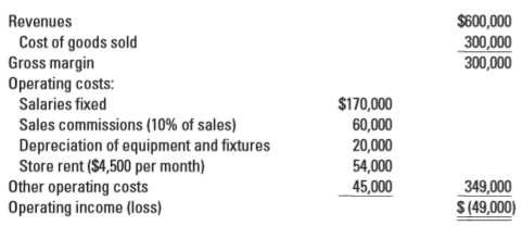 $600,000 300,000 300,000 Revenues Cost of goods sold Gross margin Operating costs: $170,000 60,000 20,000 54,000 Salaries fixed Sales commissions (10% of sales) Depreciation of equipment and fixtures Store rent ($4,500 per month) Other operating costs Operating income (loss) 45,000 349,000 S (49,000)
