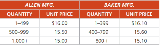 M. P. VanOyen Manufacturing has gone out on bid for a regulator component. Expected demand is 700 units per month. The item can be purchased from either Allen Manufacturing or Baker Manufacturing. Their price lists are shown in the table. Ordering cost is $50, and annual holding cost per unit is $5.