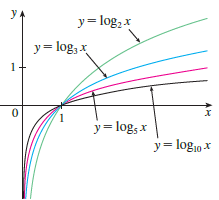 > Use Formula 10 to graph the given functions on a common screen. How are these graphs related? y = log1.5 x, y = ln x, y = log10 x, y = log50 x