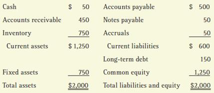 Cash $ 50 Accounts payable $ 500 Accounts receivable 450 Notes payable 50 Inventory 750 Accruals 50 Current assets $ 1,250 Current liabilities $ 600 Long-term debt 150 Fixed assets 750 Common equity 1,250 Total assets $2,000 Total liabilities and equity $2,000
