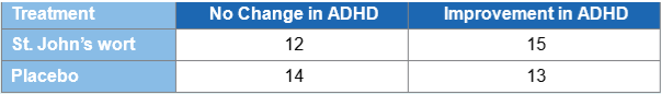 Effect on ADHD Treatment No Change in ADHD Improvement in ADHD St. John's wort 12 15 Placebo 14 13