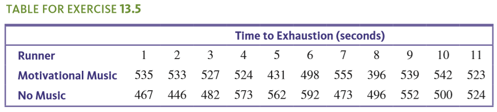 TABLE FOR EXERCISE 13.5 Time to Exhaustion (seconds) Runner 1 2 3 4 6. 7 8 9. 10 11 Motivational Music 535 533 527 524 431 498 555 396 539 542 523 No Music 467 446 482 573 562 592 473 496 552 500 524