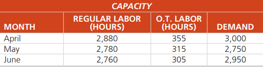 Maple Leaf Foundary, owned by Ahmet Satir, produces cast-iron ingots according to a 3-month capacity plan. The cost of labour averages $100 per regular shift hour and $140 per overtime (O.T.) hour. Inventory carrying cost is thought to be $4 per labour-hour of inventory carried. There are 50 direct laborious of inventory left over from March. For the next 3 months, demand and capacity (in labour-hours) are as follows: