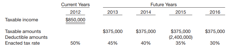 Current Years Future Years 2012 2013 2014 2015 2016 Taxable income $850,000 $375,000 $375,000 $375,000 (2,400,000) Taxable amounts $375,000 Deductible amounts Enacted tax rate 50% 45% 40% 35% 30%