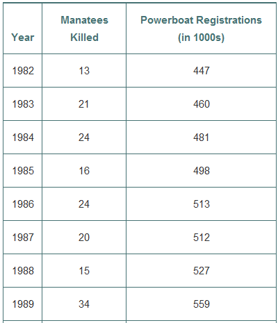 Marine biologists warn that the growing number of powerboats registered in Florida threatens the existence of manatees. The data in the table come from the Florida Fish and Wildlife Conservation Commission (myfwc.com/research/manatee/) and the U.S. Coast Guard Office of Auxiliary and Boating Safety (www.uscgboating.org/library/accident-statistics/Recreational-Boating-Statistics-2015.pdf).