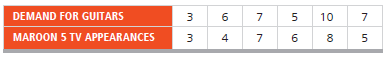 Mark Gershon, owner of a musical instrument distributorship, thinks that demand for guitars may be related to the number of television appearances by the popular group Maroon 5 during the previous month. Mark has collected the data shown in the following table: