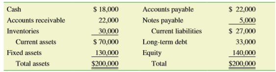 Cash $ 18,000 Accounts payable $ 22,000 Accounts receivable 22,000 Notes payable 5,000 Inventories 30,000 Current liabilities $ 27,000 $ 70,000 Current assets Long-term debt 33,000 Fixed assets 130,000 Equity 140,000 Total assets $200,000 Total $200,000