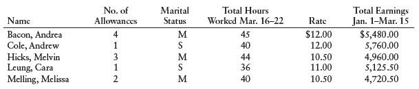 The payroll data for each employee for the week ended March 22, 20â, are given below. Employees are paid 1½ times the regular rate for working over 40 hours a week.