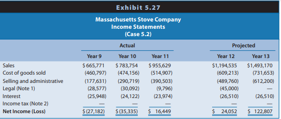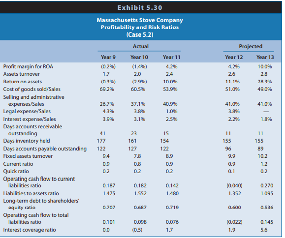 3. Installment financing plan: The company has a financing arrangement with a local bank to finance the purchase of stoves by credit-approved customers. The company is liable if customers fail to repay their installment bank loans. The imposition of strict air emission standards by the Environmental Protection Agency (EPA) has resulted in a major change in the woodstove industry. By December 31, Year 9, firms were required by EPA regulations to demonstrate that their woodstoves met or surpassed specified air emission standards. These standards were stricter than industry practices accommodated at the time, and firms had to engage in numerous company-sponsored and independent testing of their stoves to satisfy EPA regulators. As a consequence, the number of firms in the woodstove industry decreased from more than 200 in the years prior to Year 10 to approximately 35 by December 31, Year 11. The company received approval for its Soapstone Stove I in Year 11, after incurring retooling and testing costs of $63,001. It capitalized these costs in the Property, Plant, and Equipment account. It depreciates these costs over the five-year EPA approval period. A second stove, Soapstone Stove II, is currently undergoing retooling and testing. For this stove, the company incurred costs of $19,311 in Year 10 and $8,548 in Year 11 and has received preliminary EPA approval. It anticipates additional design, tooling, and testing costs of approximately $55,000 in Year 12 and $33,000 in Year 13 to obtain final EPA approval. The company holds an option to purchase the building in which it is located for $608,400. The option also permits the company to assume the unpaid balance on a low-interest-rate loan on the building from the New England Regional Industrial Development Authority. The interest rate on this loan is adjusted annually and equals 80% of the bank prime interest rate. The unpaid balance on the loan exceeds the option price and will result in a cash transfer to the company from the owner of the building at the time of transfer. The company exercised its option in Year 9, but the owner of the building refused to comply with the option provisions. The company sued the owner. The case has gone through the lower court system in Massachusetts and is currently under review by the Massachusetts Supreme Court. The company incurred legal costs totaling $68,465 through Year 11 and anticipates additional costs of approximately $45,000 in Year 12. The lower courts have ruled in favor of the companyâs position on all of the major issues in the case. The company expects the Massachusetts Supreme Court to concur with the decisions of the lower courts when it renders its final decision in the spring of Year 12. The company has held discussions with two prospective tenants for the buildingâs 10,000 square feet that Massachusetts Stove Company does not use in its operations. Jane OâNeil owns 51% of the companyâs common stock. The remaining stockholders include John OâNeil (chief financial officer and father of Jane OâNeil), Mark Forest (vice president of manufacturing), and four independent local investors. To assist in the loan decision, the company provides you with financial statements (see the first three columns of Exhibits 5.27â5.29) and notes for the three years ending December 31, Year 9, Year 10, and Year 11. These financial statements were prepared by John OâNeil, chief financial officer, and are not audited. The company also provides you with projected financial statements for Year 12 and Year 13 (see the last two columns of Exhibits 5.27â5.29) to demonstrate its need for the loan and its ability to repay. The loan requested involves an increase in the current loan amount from $93,091 to $143,091. The company will pay monthly interest and repay the $50,000 additional amount borrowed by December 31, Year 13. Exhibit 5.30 presents financial statement ratios for the company.