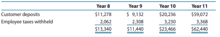Other Current Liabilities: The large increase at the end of Year 11 resulted from a major promotional offer in the fall of Year 11, which increased the amount of deposits by customers. The projected amounts for Year 12 and Year 13 represent more normal expected levels of deposits.