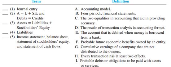 Term Definition (1) Journal entry (2) A = L+ SE, and A. Accounting model. B. Four periodic financial statements. C. The two equalities in accounting that aid in providing Debits = Credits (3) Assets = Liabilities + Stockholders' Equity (4) Liabilities (5) Income statement, balance sheet, statement of Stockholders' Equity, F. Probable future economic benefits owned by an entity. accuracy. - D. The results of transaction analysis in accounting format. E. The account that is debited when money is borrowed from a bank. G. Cumulative earnings of a company that are not distributed to the owners. H. Every transaction has at least two effects. I. Probable debts or obligations to be paid with assets or services. and statement of cash flows