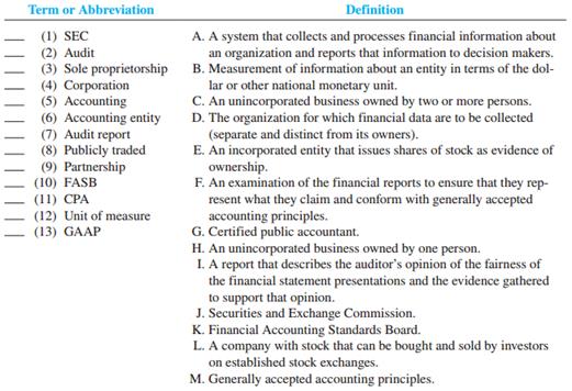 Term or Abbreviation Definition (1) SEC (2) Audit (3) Sole proprietorship B. Measurement of information about an entity in terms of the dol- (4) Corporation (5) Accounting (6) Accounting entity (7) Audit report (8) Publicly traded (9) Partnership (10) FASB A. A system that collects and processes financial information about an organization and reports that information to decision makers. lar or other national monetary unit. C. An unincorporated business owned by two or more persons. D. The organization for which financial data are to be collected (separate and distinct from its owners). E. An incorporated entity that issues shares of stock as evidence of ownership. F. An examination of the financial reports to ensure that they rep- resent what they claim and conform with generally accepted accounting principles. G. Certified public accountant. H. An unincorporated business owned by one person. I. A report that describes the auditor's opinion of the fairness of the financial statement presentations and the evidence gathered (11) CPA (12) Unit of measure (13) GAAP to support that opinion. J. Securities and Exchange Commission. K. Financial Accounting Standards Board. L. A company with stock that can be bought and sold by investors on established stock exchanges. M. Generally accepted accounting principles.
