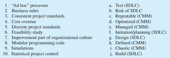 1. “Ad hoc" processes a. Test (SDLC) 2. Business rules b. Risk of SDLC c. Repeatable (CMM) d. Optimized (CMM) e. Managed (CMM) f. Initiation/planning (SDLC) g. Design (SDLC) h. Defined (CMM) i. Chaotic (CMM) j. Build (SDLC) 3. Consistent project standards 4. Cost overrun 5. Discrete project standards 6. Feasibility study 7. Improvement part of organizational culture 8. Modular programming code 9. Simulations 10. Statistical project control