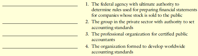 1. The federal agency with ultimate authority to determine rules used for preparing financial statements for companies whose stock is sold to the public 2. The group in the private sector with authority to set accounting standards 3. The professional organization for certified public accountants 4. The organization formed to develop worldwide accounting standards