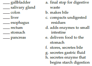 - gallbladder _ salivary gland colon a. final stop for digestive waste b. makes bile c. compacts undigested residues liver - esophagus . rectum stomach d. adds enzymes to small intestine e. delivers food to the stomach pancreas f. stores, secretes bile g. secretes gastric fluid h. secretes enzyme that begins starch digestion