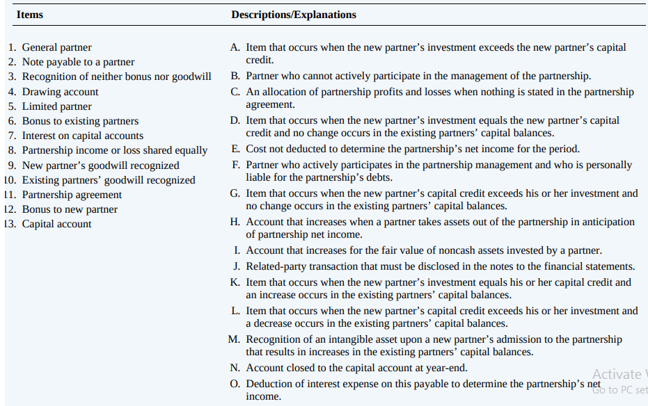 Items Descriptions/Explanations 1. General partner 2. Note payable to a partner 3. Recognition of neither bonus nor goodwill 4. Drawing account 5. Limited partner 6. Bonus to existing partners 7. Interest on capital accounts 8. Partnership income or loss shared equally 9. New partner's goodwill recognized LO. Existing partners' goodwill recognized 11. Partnership agreement 12. Bonus to new partner 13. Capital account A. Item that occurs when the new partner's investment exceeds the new partner's capital credit. B. Partner who cannot actively participate in the management of the partnership. C. An allocation of partnership profits and losses when nothing is stated in the partnership agreement. D. Item that occurs when the new partner's investment equals the new partner's capital credit and no change occurs in the existing partners' capital balances. E. Cost not deducted to determine the partnership’s net income for the period. F. Partner who actively participates in the partnership management and who is personally liable for the partnership's debts. G. Item that occurs when the new partner's capital credit exceeds his or her investment and no change occurs in the existing partners’ capital balances. H. Account that increases when a partner takes assets out of the partnership in anticipation of partnership net income. I. Account that increases for the fair value of noncash assets invested by a partner. J. Related-party transaction that must be disclosed in the notes to the financial statements. K. Item that occurs when the new partner's investment equals his or her capital credit and an increase occurs in the existing partners’ capital balances. L. Item that occurs when the new partner’s capital credit exceeds his or her investment and a decrease occurs in the existing partners’ capital balances. M. Recognition of an intangible asset upon a new partner's admission to the partnership that results in increases in the existing partners’ capital balances. N. Account closed to the capital account at year-end. O. Deduction of interest expense on this payable to determine the partnership's net Activate Go to PC set income.