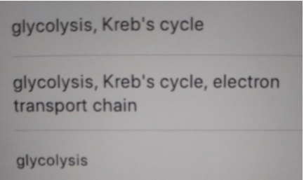 glycolysis, Kreb's cycle glycolysis, Kreb's cycle, electron transport chain glycolysis