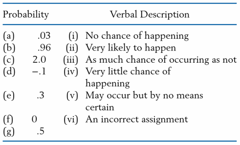 > For each numerical value assigned to the probability of an event, identify the verbal statements that are appropriate. (a) 1.1 (b) 1/1.1 (c) 1/2 (d) 43/47 (e) 1/89 (f) 1.0 Verbal statements: (i) cannot be a probability, (ii) the event is very unlikely to
